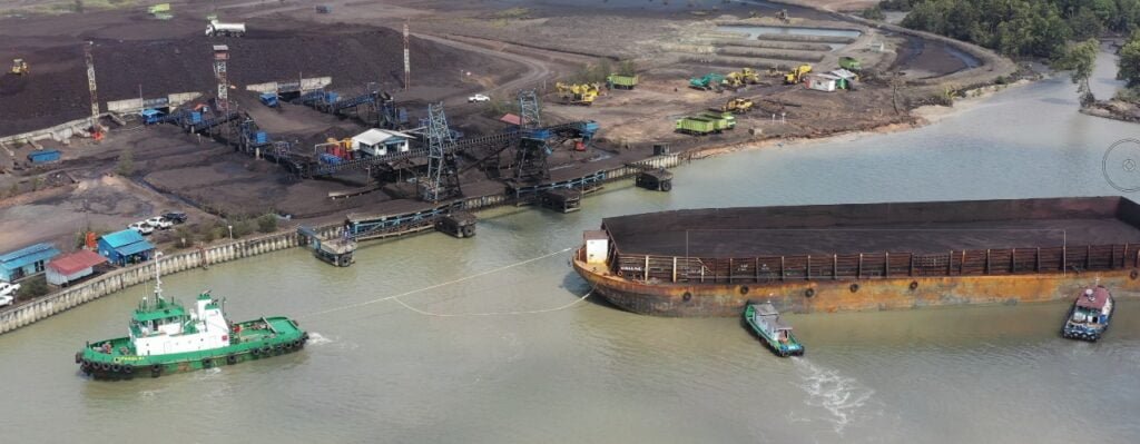 The barge is pulled by the tugboat carrying cargo from the loading port to the Mother Vessel waiting at the mouth of the river/off sea to transfer the cargo from the barge to the Mother Vessel. The Mother Vessel cannot enter the river or dock at the loading port because it has a greater depth than the river or loading port.
