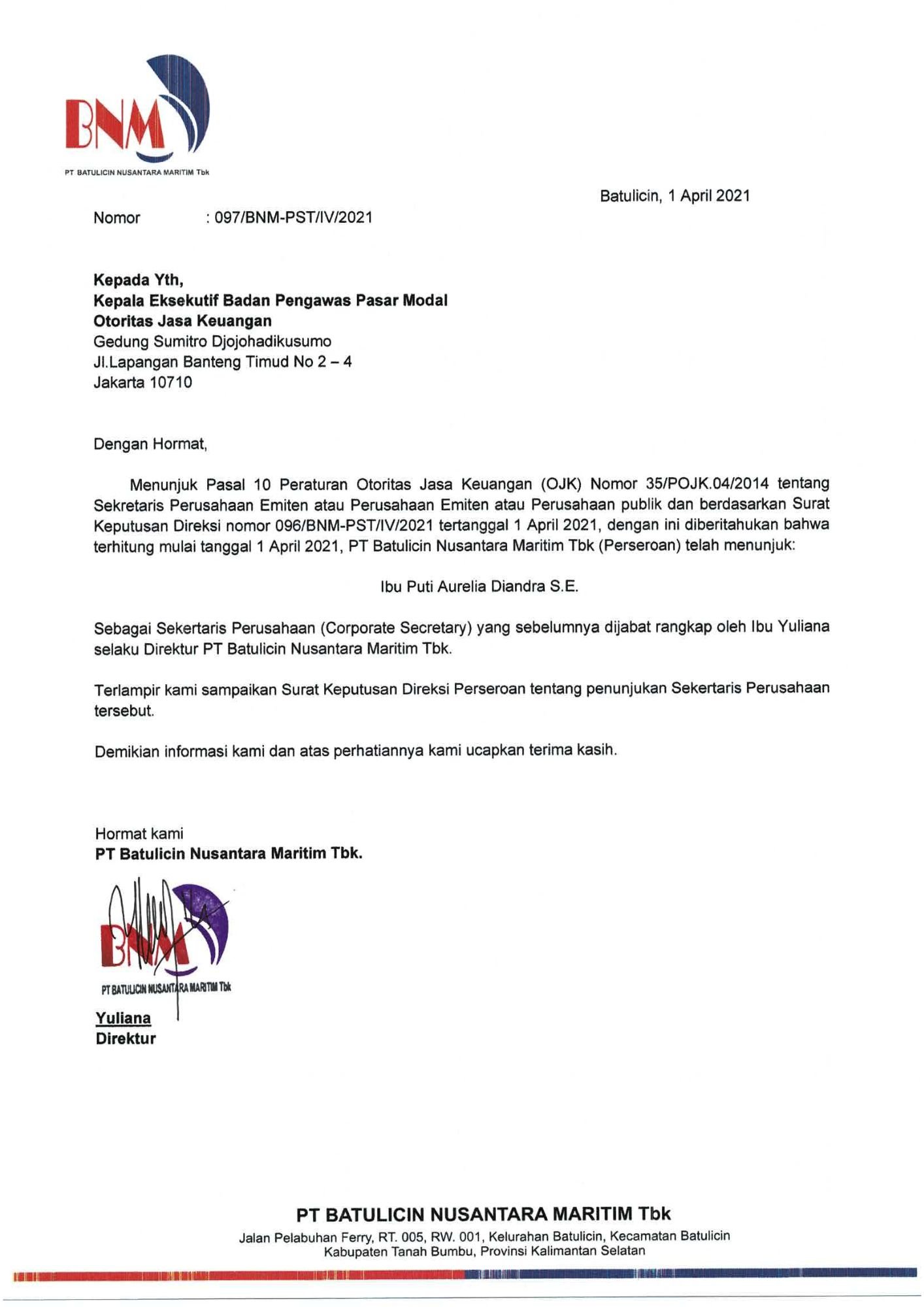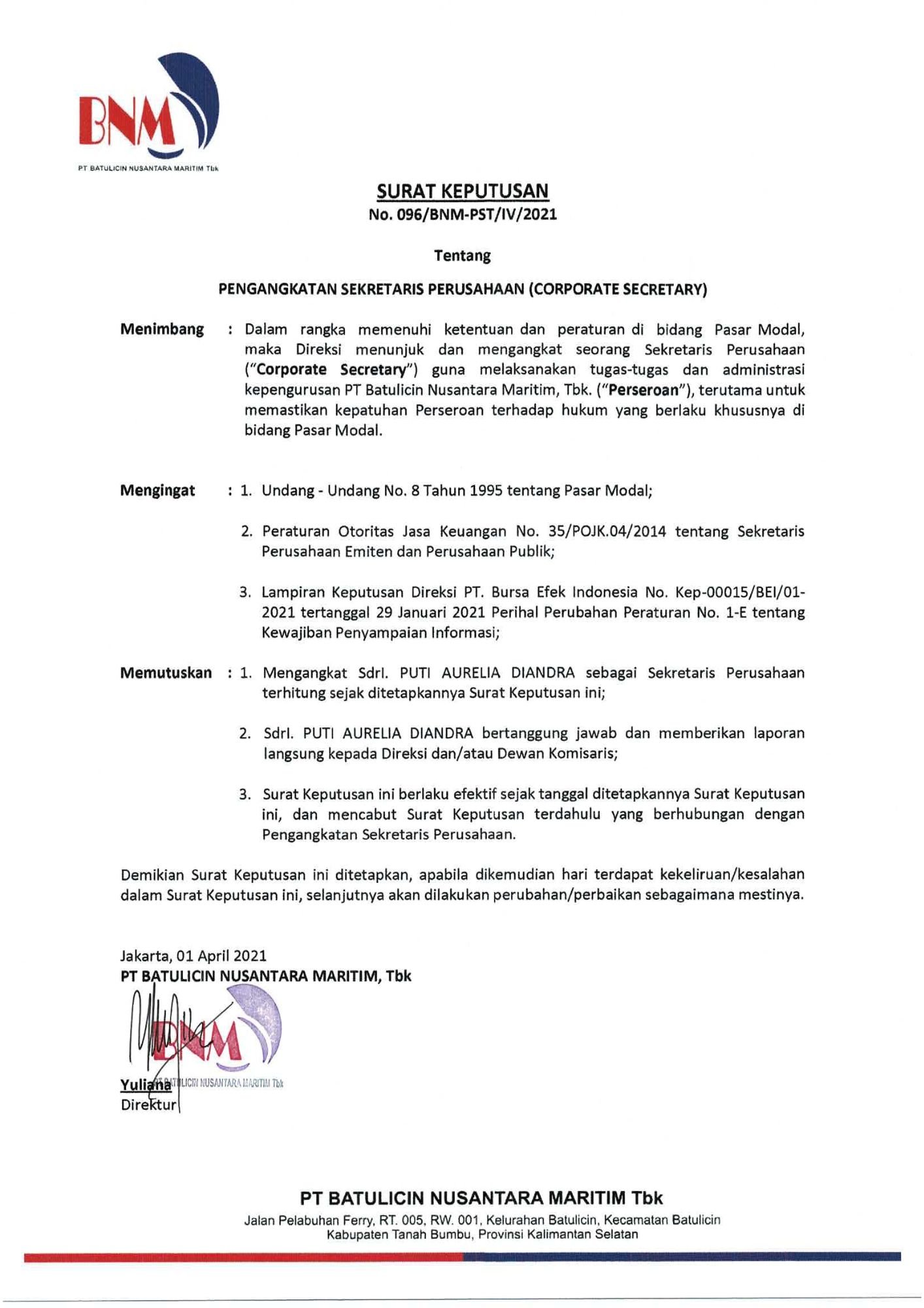 Menunjuk Pasal 10 Peraturan Otoritas Jasa Keuangan (OJK) Nomor 35/POJK.04/2014 Tentang Sekretaris Perusahaan Emiten atau Perusahaan Publik dan Berdasarkan Surat Keputusan Direksi No. 096/BNM-PST/IV/2021 Tertanggal 01 April 2021, Dengan ini diberitahukan bahwa terhitung mulai Tanggal 01 April 2021, PT Batulicin Nusantara Maritim Tbk (Perseroan) Telah Menunjuk :